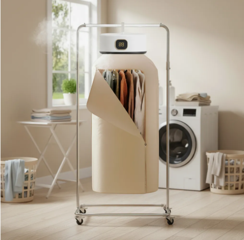 Seu design vertical com cortina térmica cria um ambiente fechado e altamente eficiente, distribuindo o calor de forma uniforme para secar as peças com segurança, sem danificar tecidos delicados. Além disso, o suporte com rodinhas oferece mobilidade total: você leva o secador para qualquer canto da casa com facilidade.