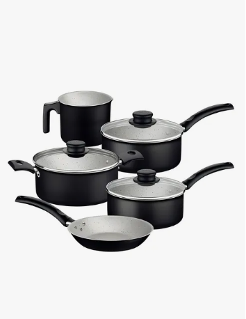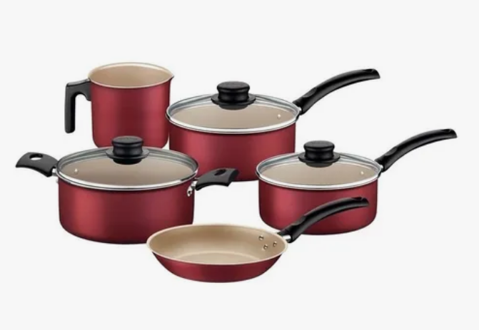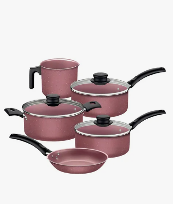 As panelas possuem **revestimento antiaderente durável**, que evita que os alimentos grudem e facilita a limpeza. Com design moderno, elas contam com tampas de vidro temperado, permitindo acompanhar o preparo sem perder o sabor. Já os potes herméticos, além de elegantes, mantêm seus alimentos sempre frescos por muito mais tempo.