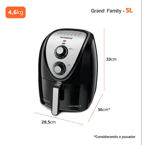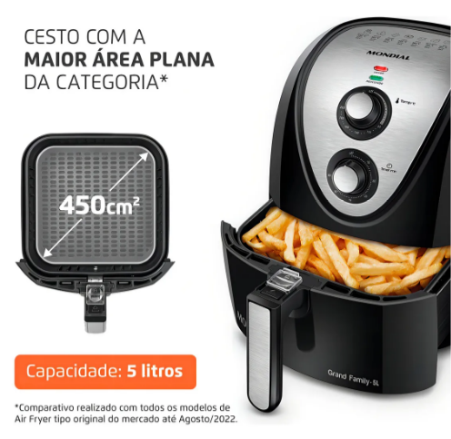 Transforme sua rotina na cozinha com a Air Fryer Mondial Grand Family 5L — a combinação perfeita entre **rapidez, eficiência e sabor irresistível. Com 1900W de potência** e capacidade de 5 litros, ela prepara desde pequenas porções até refeições completas para toda a família, sem esforço e sem óleo, garantindo uma alimentação mais saudável e leve.