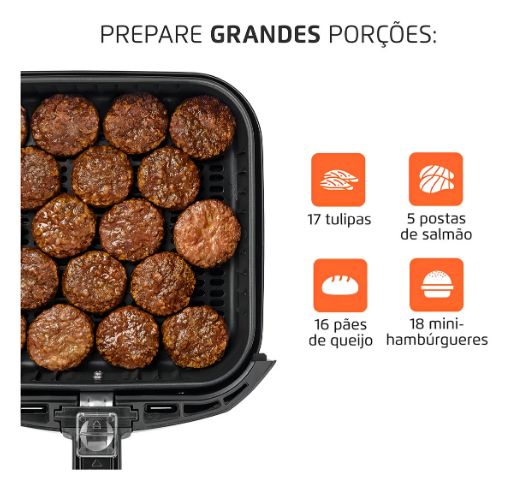 👉 Prepare 17 tulipas, 5 postas de salmão, 16 pães de queijo ou até 18 mini-hambúrgueres de uma só vez!