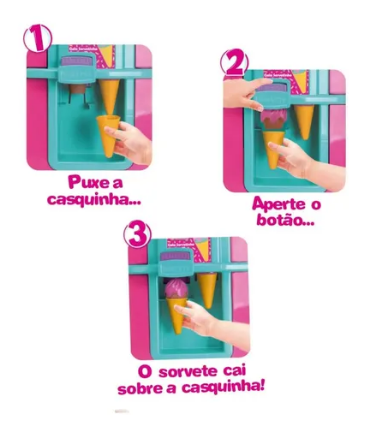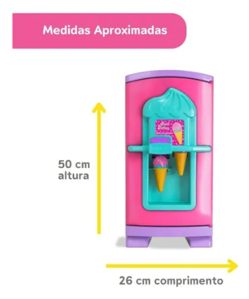 Com **50 cm de altura e 26 cm de comprimento**, o brinquedo é perfeito para incentivar a **imaginação, a criatividade e o faz de conta**, transformando qualquer momento em uma verdadeira sorveteria.